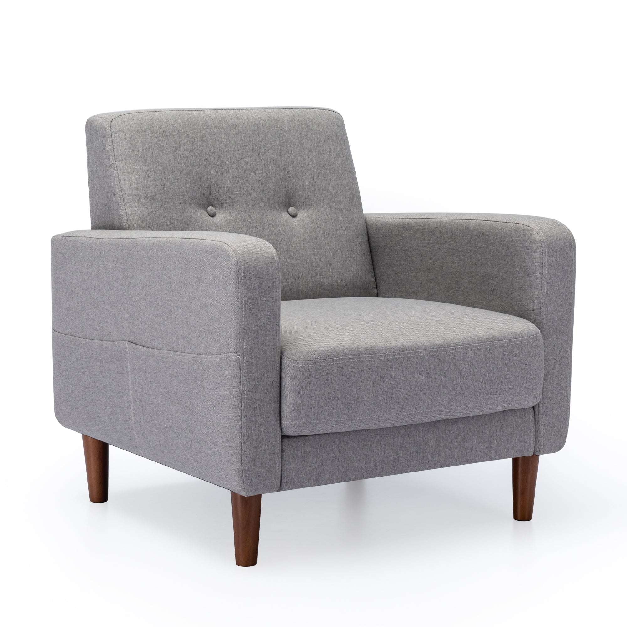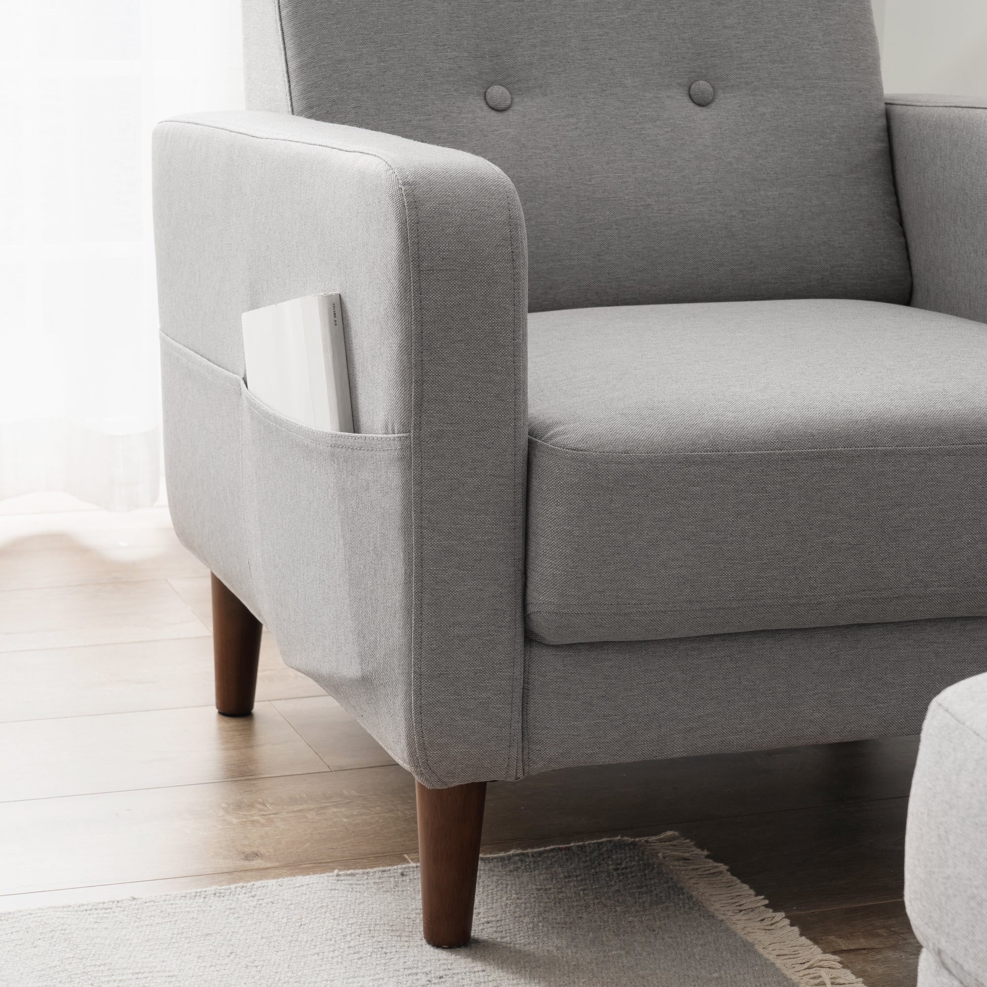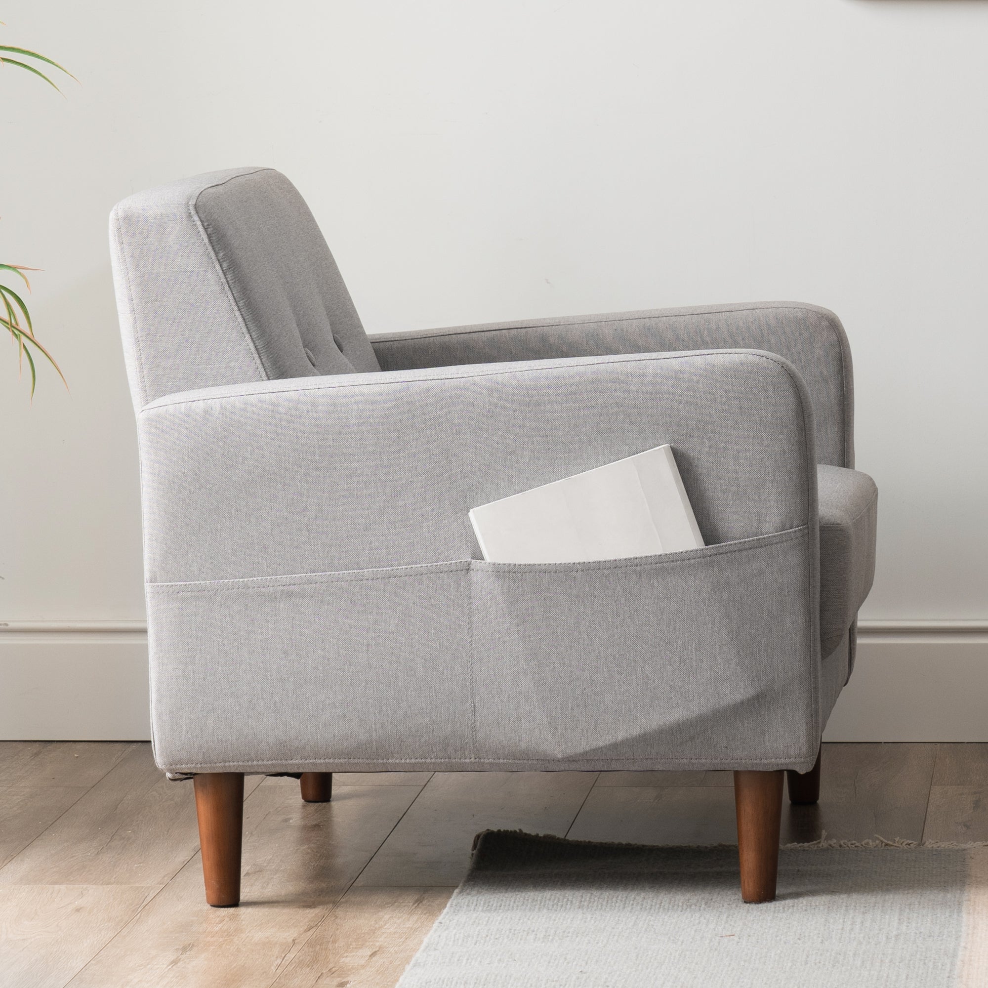 The built in side pocket keeps your book, tablet, or remote within reach. A real eucalyptus wood frame and tapered legs pair with lint resistant polyester linen upholstery for durability you can feel.